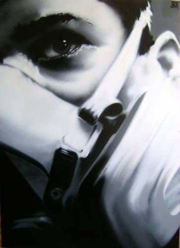 Граффити, вся работа выполнена баллончиками с краской, от руки, без использования трафаретов, задействованна кисть (блики в глазу). Выполнено на двп размер 110 на 78 сантиметров приблизительно.